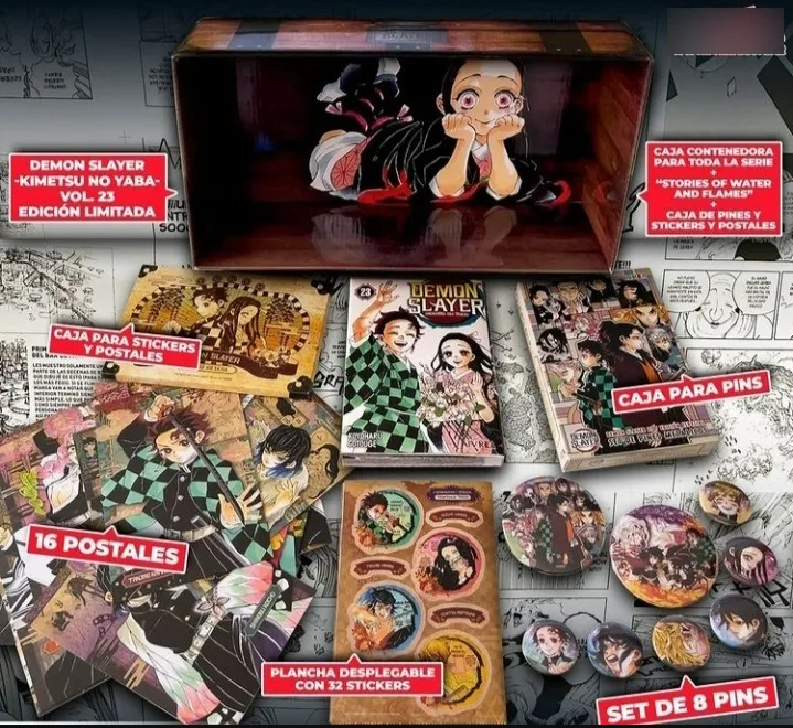 DEMON 23 EDICION ESPECIAL , NO INCLUYE TOMO 1 AL 22 ,. —-NOTA: esto es una edición especial del tomo 23, NO un boxset. Los tomos 1 a 22 y Water and Flame deben comprarse por separado.—– Además del tomo #23, la edición especial incluirá 16 POSTALES, una PLANCHA CON 32 STICKERS y un SET DE 8 PINS (2 de 75mm y 6 de 38mm). Como si todo esto fuese poco, se incluirá una CAJA CONTENEDORA para guardar los 23 tomos de la serie, el tomo único STORIES OF WATER AND FLAME más las cajitas que contienen los pines, postales y stickers.