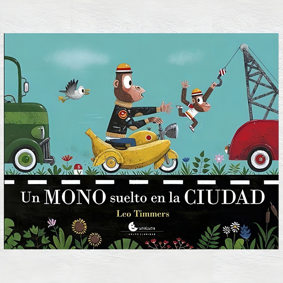 El papá Mono y su pequeño hijo están manejando por la ciudad. ¡Pero hay tantos autos que el pequeño mono no tiene paciencia! Así que se escapa de su asiento y trepa desde la escalera de la autobomba hasta la grúa, salta sobre el camión y cae sobre un taxi.